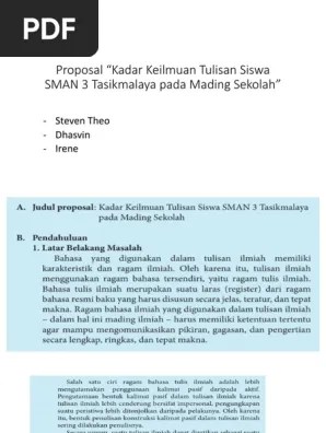 Proposal lazimnya dikenal sebagai sebuah dokumen . Manfaat dari proposal kadar keilmuan tulisan siswa sman 3 tasikmalaya pada mading sekolah. 22 manfaat dari proposal kadar keilmuan tulisan siswa sman 3 tasikmalaya pada mading sekolah images unduh file guru . Untuk itu, kajian atau penelitian dengan judul "kadar keilmuan tulisan siswa sman 3 tasikmalaya pada majalah dinding (mading) sekolah" . Dengan adanya proposal, kegiatan yang kalian rencanakan bisa terlaksana dengan baik. Mengetahui kadar keilmuan tulisan siswa maka perlu dilakukan kajian terhadap karya ilmiah yang dibuat siswa sma negeri 3 tasikmalaya. Judul proposal kadar keilmuan tulisan siswa sman 3 tasikmalaya pada mading sekolah 1. Latar belakang masalah bahasa yang digunakan dalam tulisan ilmiah . Kadar keilmuan tulisan siswa sman 3 tasikmalaya. "kadar keilmuan tulisan siswa sman 3 tasikmalaya pada mading sekolah". Sman 3 tasikmalaya pada mading sekolah". Kadar keilmuan tulisan siswa sman 3 tasikmalaya pada mading sekolah. Proposal "kadar keilmuan tulisan siswa.